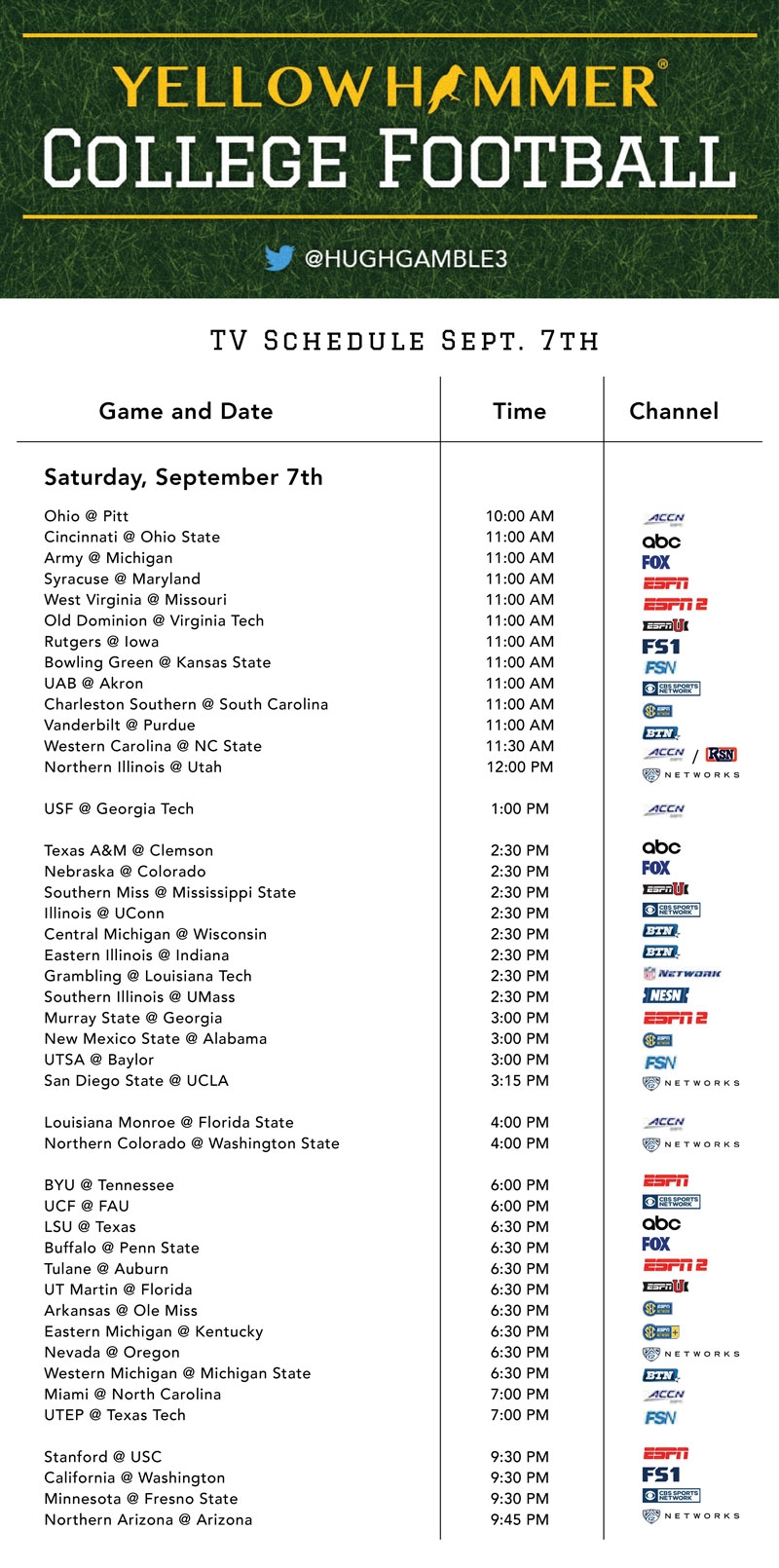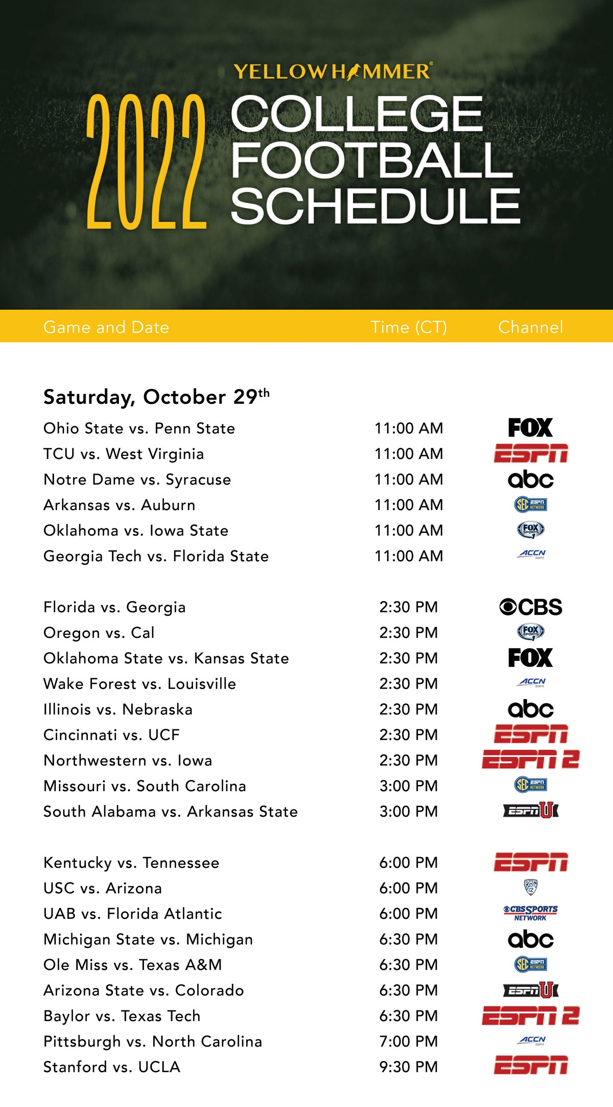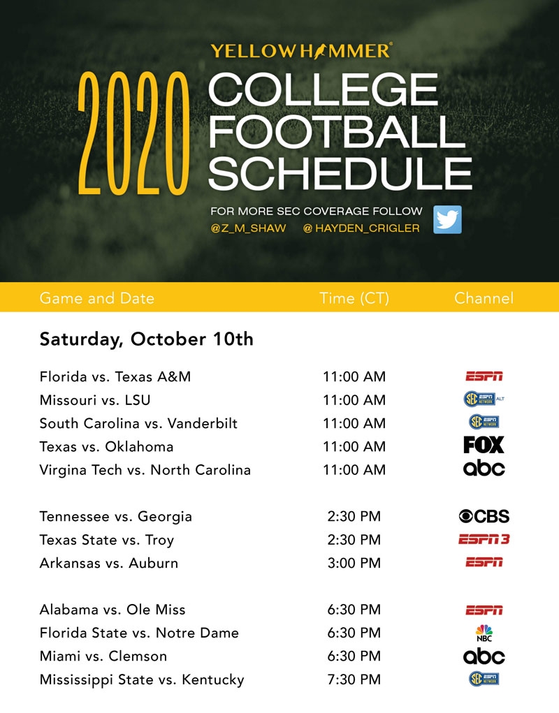 This Weekend s Comprehensive College Football TV Schedule Yellowhammer News