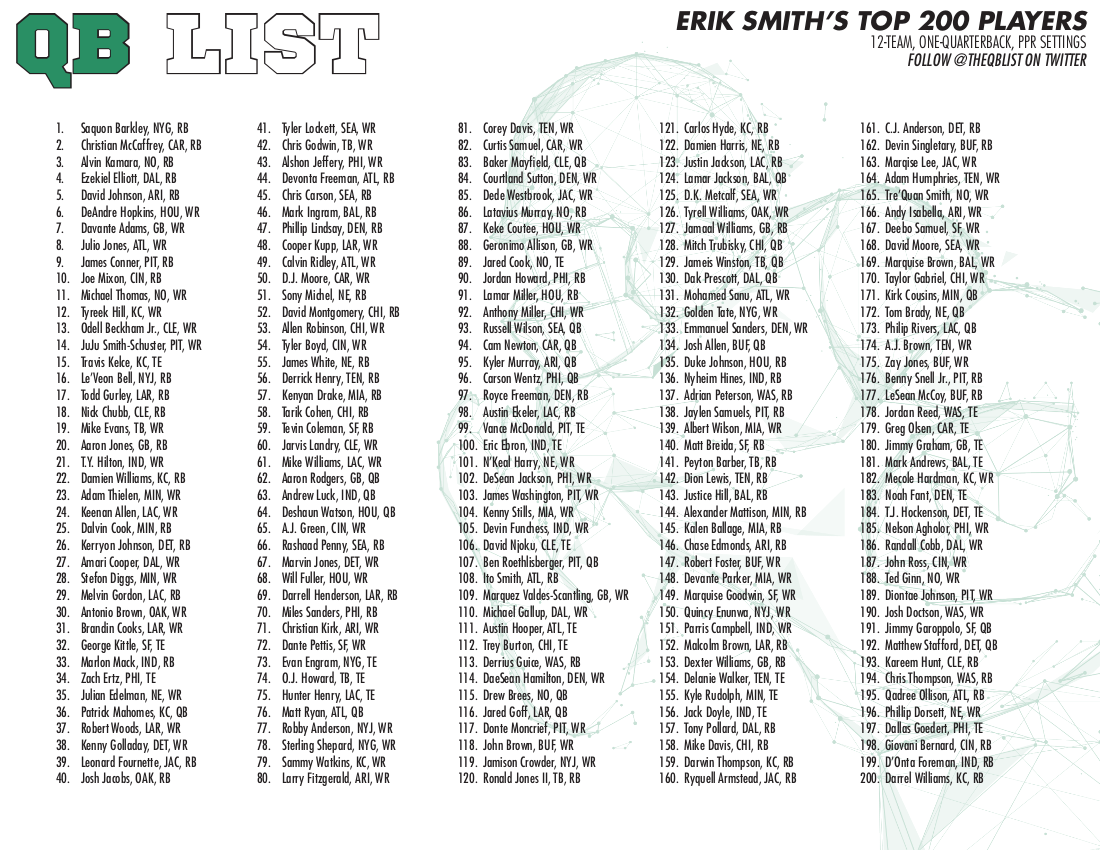 QB List Fantasy Football Cheat Sheet For 2019 Drafts QB List