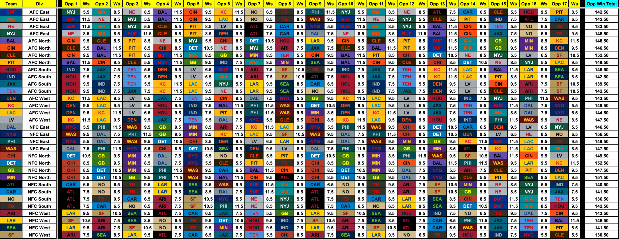 2024 NFL Schedule Team Grid