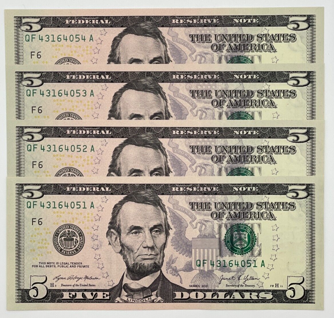 NEW Uncirculated Five Dollar Bills Series 2021 5 Sequential Bank Notes LOT Of 4 Peghasus