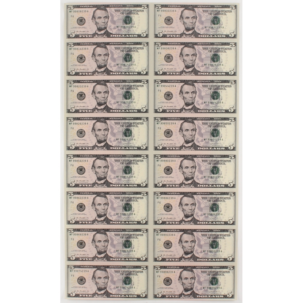 Uncut Sheet Of 16 2013 5 Bills Pristine Auction