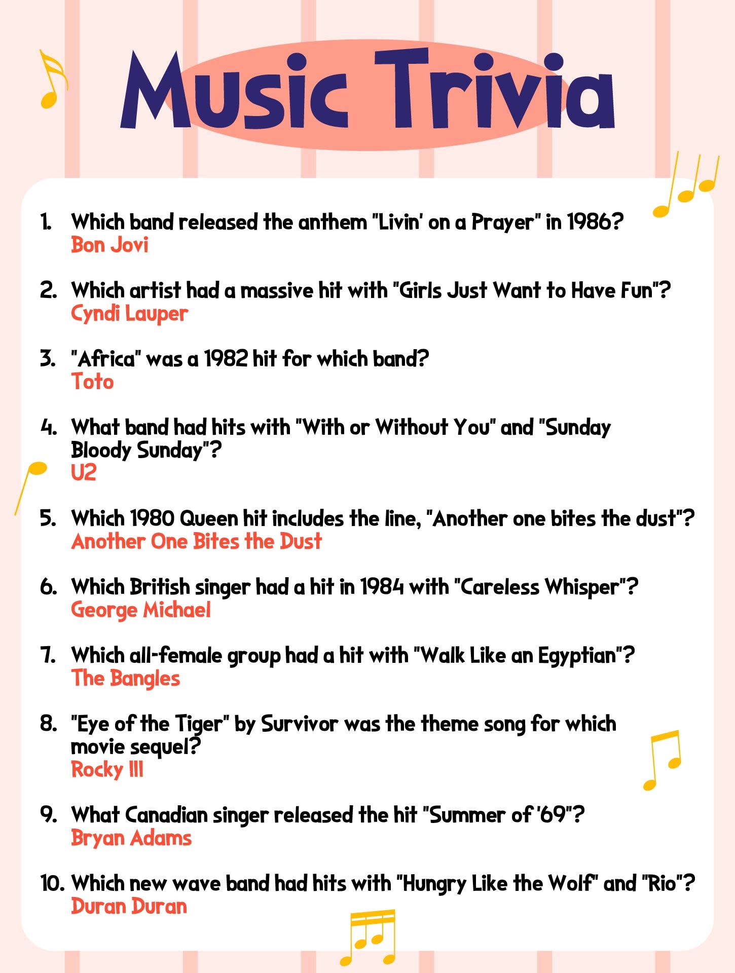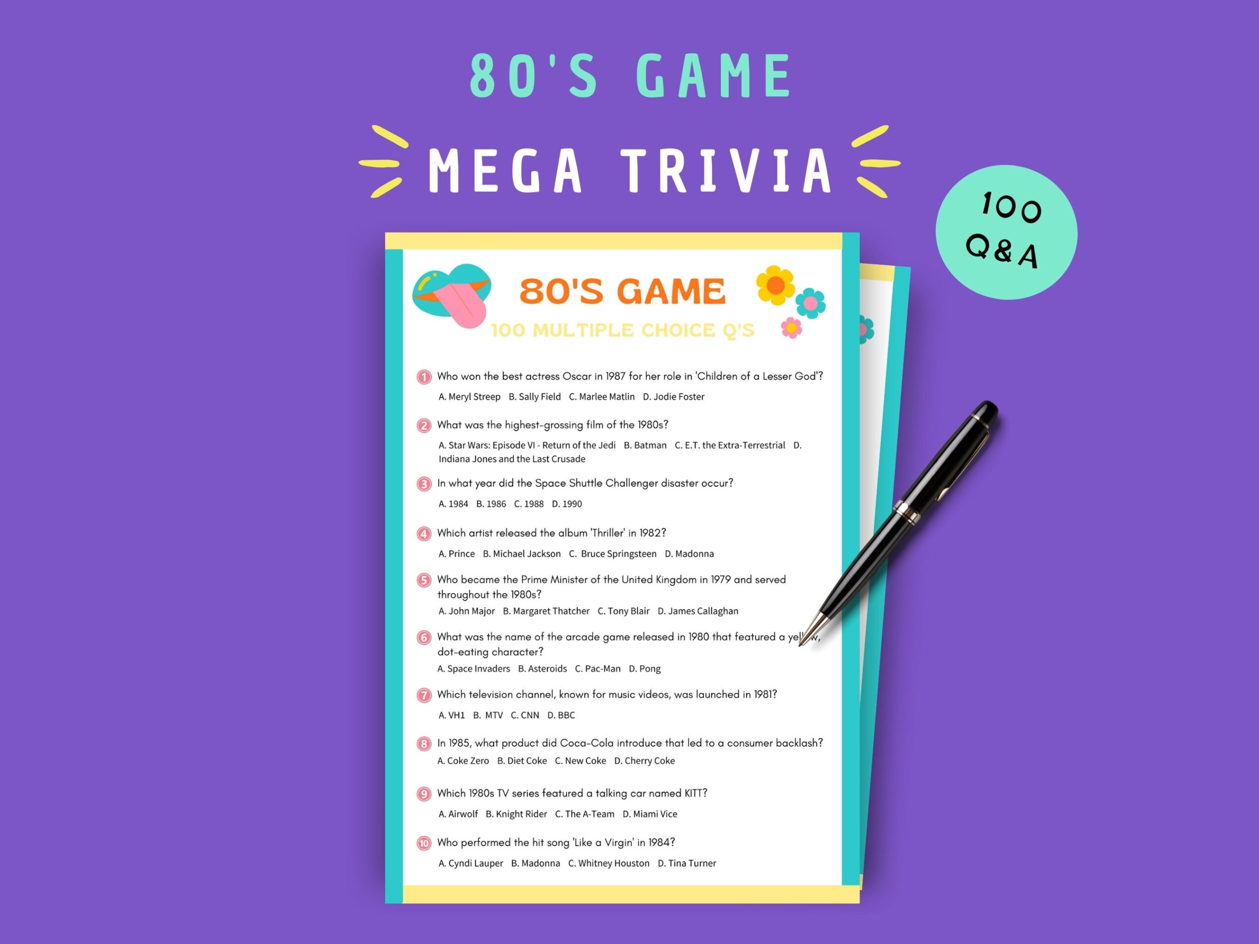 Get ready to relive the glory days of the 1980s with our printable trivia questions and answers. Whether you’re a hardcore ’80s enthusiast or just looking for a fun challenge, these questions will entertain and delight as you journey back to one of the most iconic decades in history. Let the games begin!
