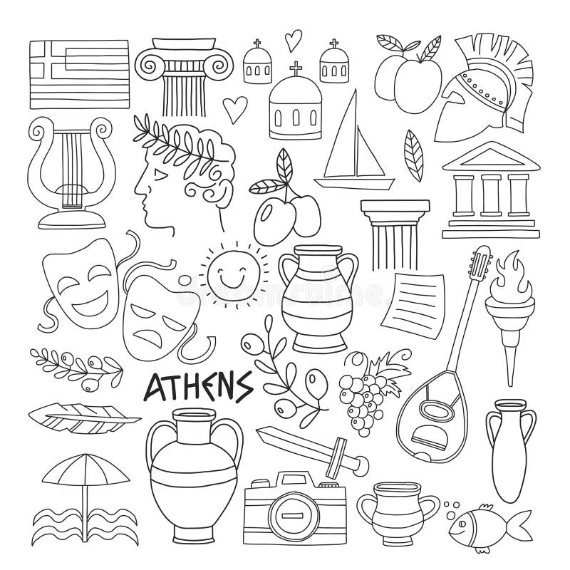 Ancient Greece Vector Elements In Doodle Style For Coloring Pages Travel History Music Food Wine Stock Vector Illustration Of Helmet Pattern 89597771