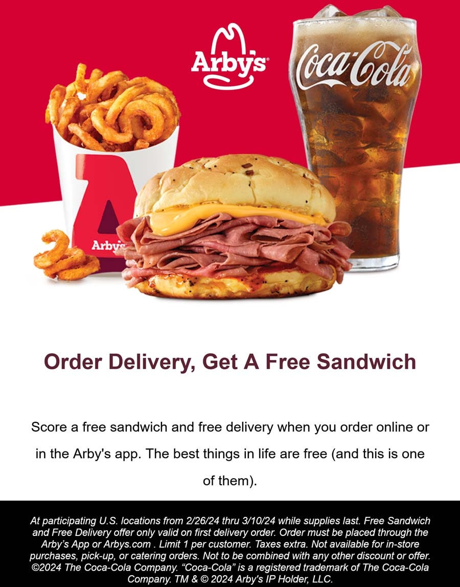 Free Sandwich With Your First Free Delivery At Arbys Arbys