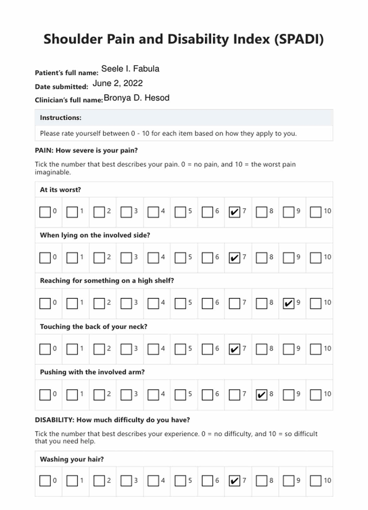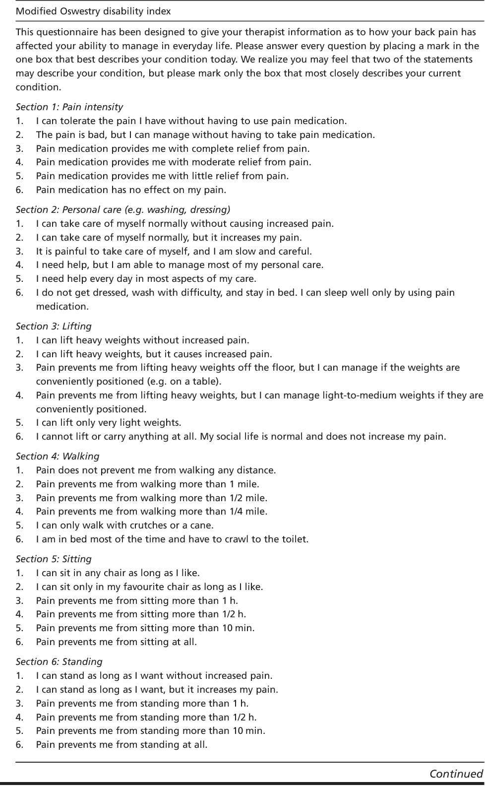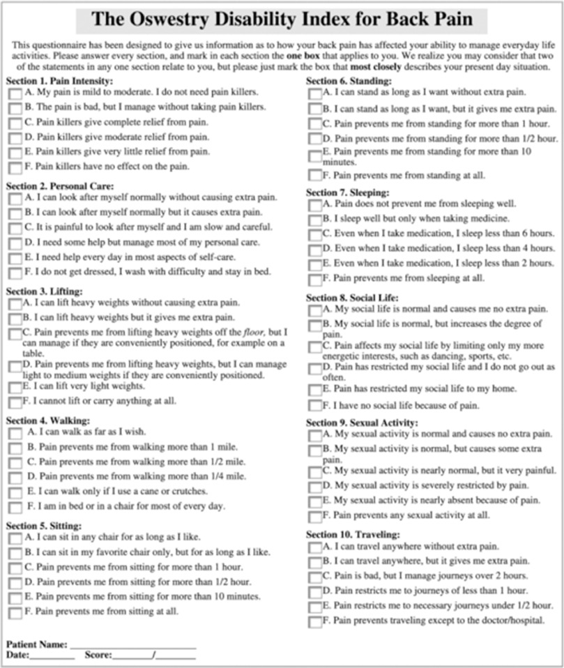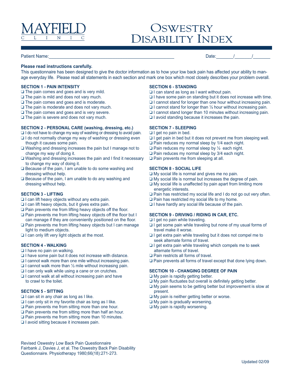 Oswestry Disability Index Questionnaire Template Mayfield Clinic