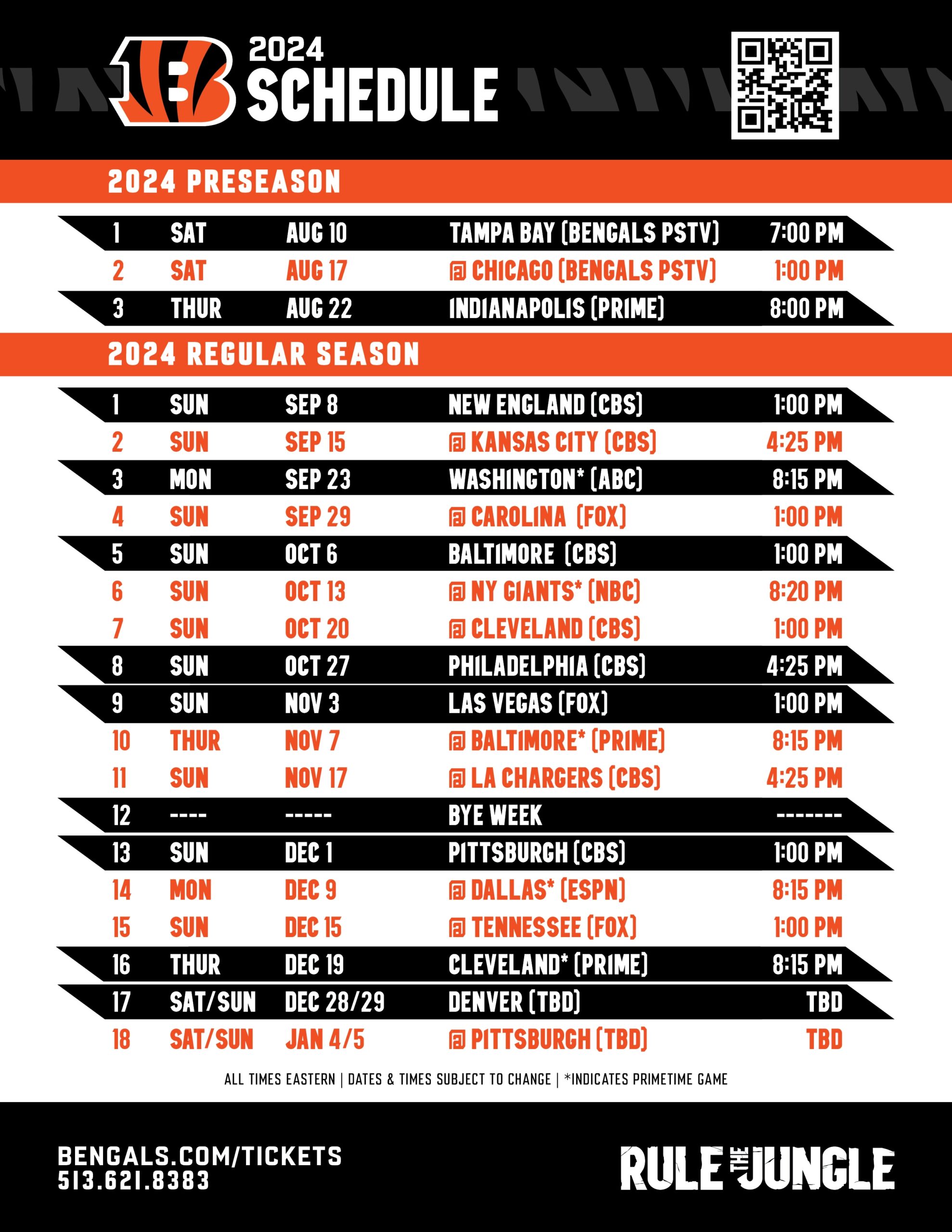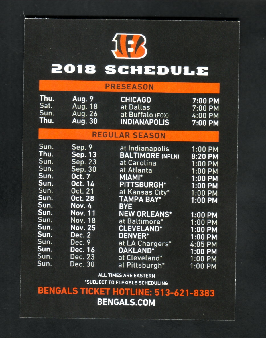 With our printable Bengals schedule for the 2018 season, you can mark your calendar for all the crucial matchups, including division rivalries and prime-time games. Hang it on your fridge, at your desk, or carry it in your wallet so you never miss a game!