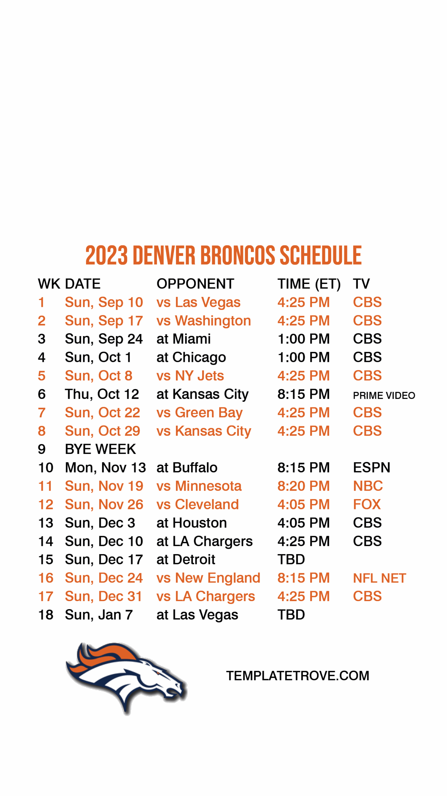 Don’t miss out on a single play this season – make sure you have your Denver Broncos schedule 2021 printable ready to go. With all the key matchups at your fingertips, you’ll be able to plan your game day celebrations and show your Broncos pride all season long. Go Broncos!