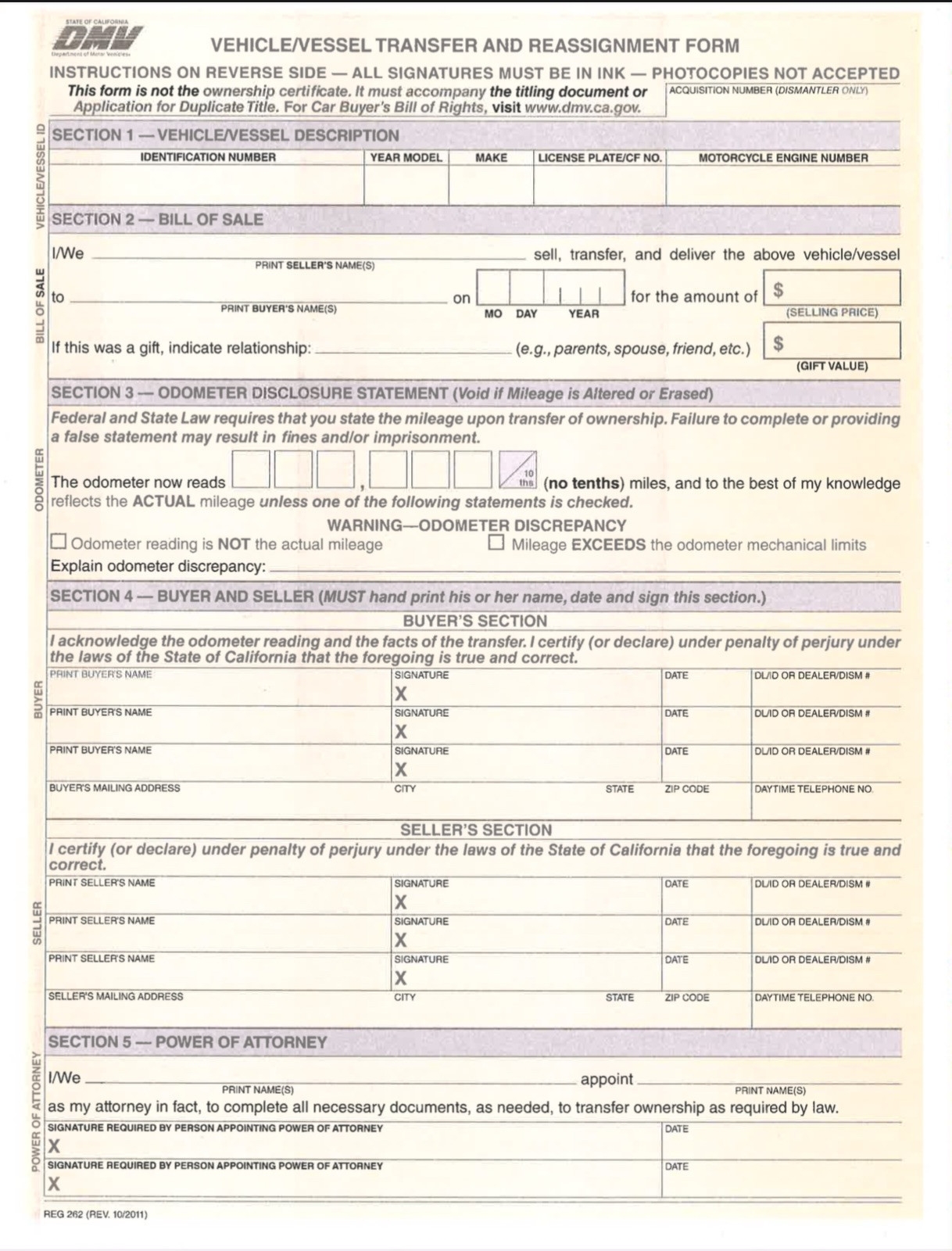 1 NEW California Bill Of Sale DMV REG 262 Form Vehicle Transfer Reassignment