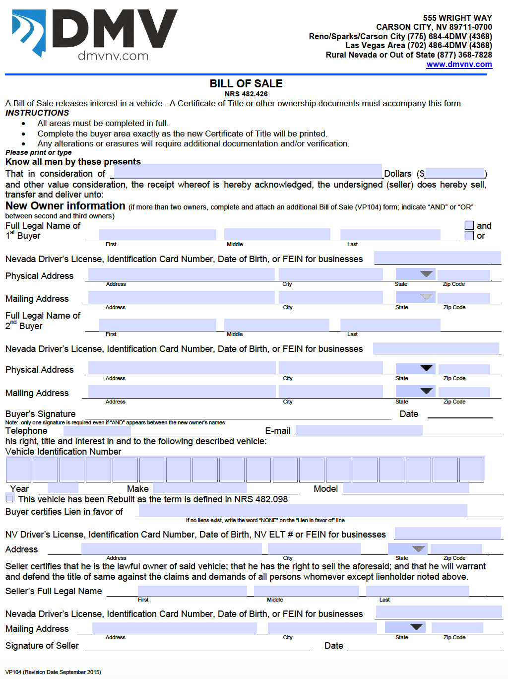 Free Nevada Motor Vehicle DMV Bill Of Sale Form PDF