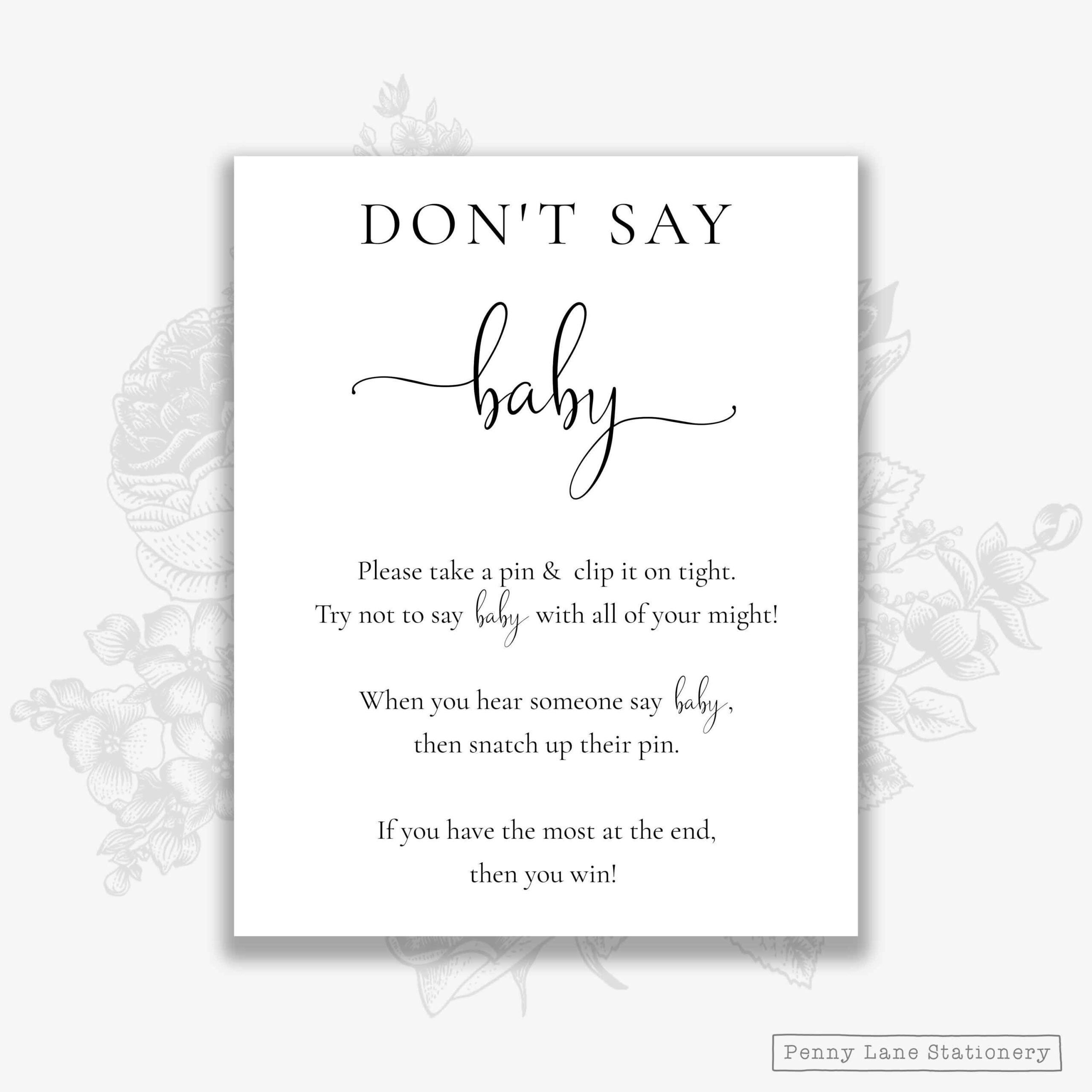 So, if you’re looking for a fun and interactive game to play at your next baby shower, be sure to give the “Don’t Say Baby” game a try. With a free printable sign, you can add a personalized touch to the game and make it even more memorable for you and your guests!