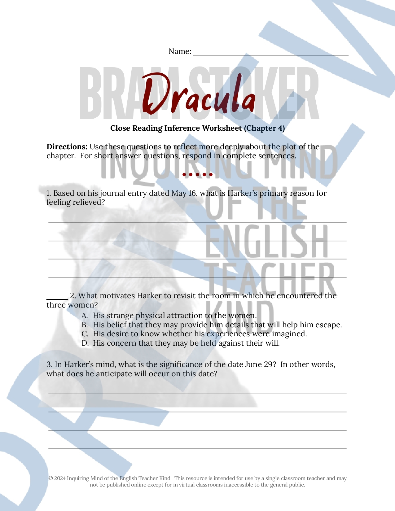 Dracula Chapter 4 Close Reading Analysis Worksheet And Answer Key Made By Teachers