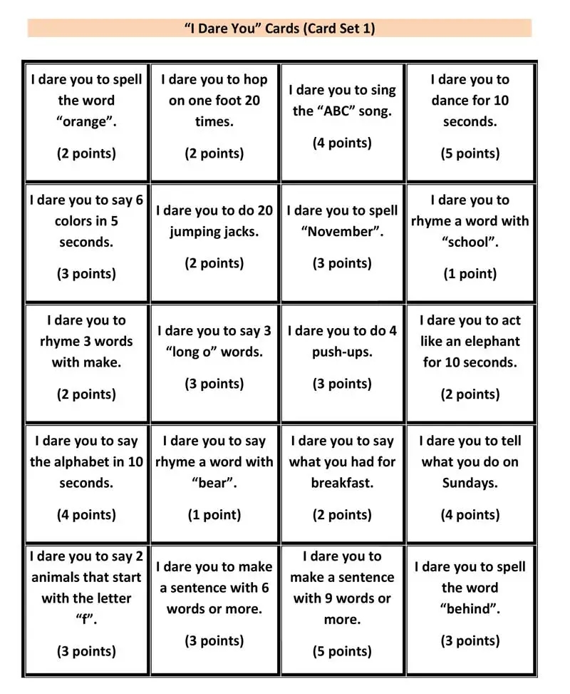 ESL Game I Dare You printable Cards Stickyball ESL Lessons