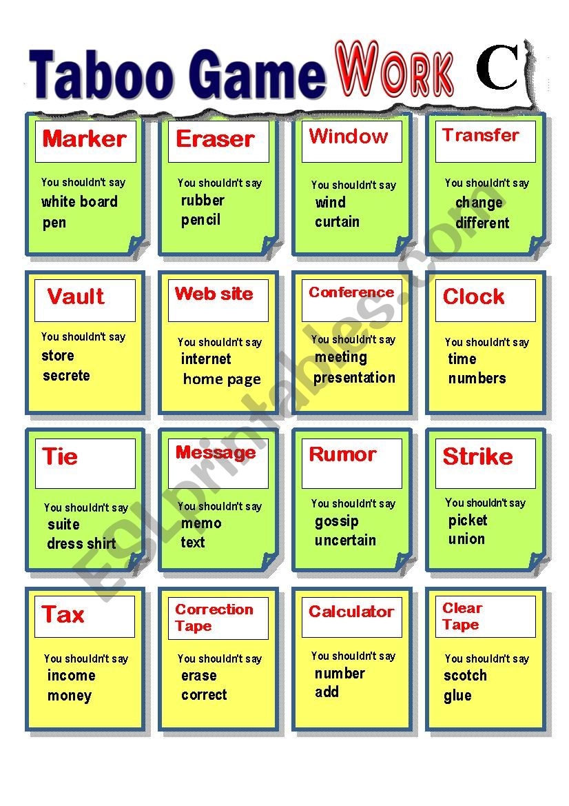 Taboo Card Guessing Game Work 2 Adult Basic ESL Worksheet By Ttuffl