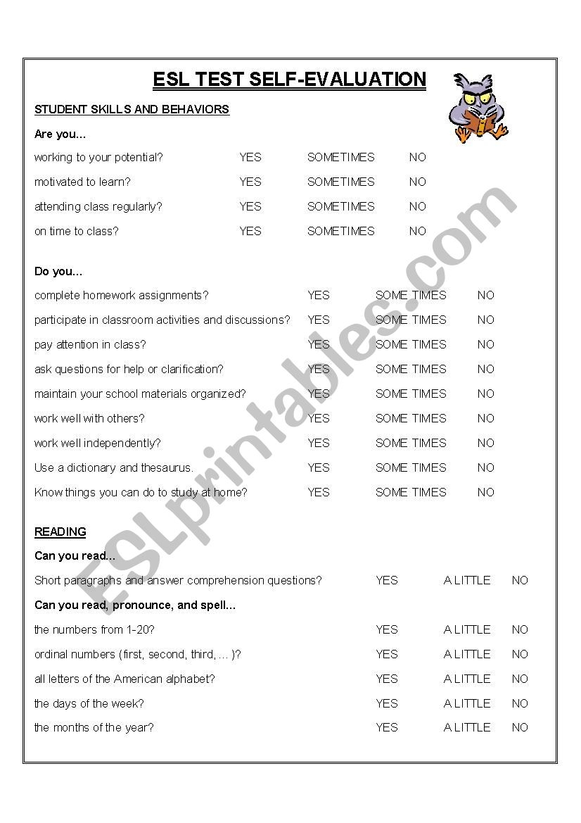 Beginner Level ESL Test Self Evaluation ESL Worksheet By Clov90