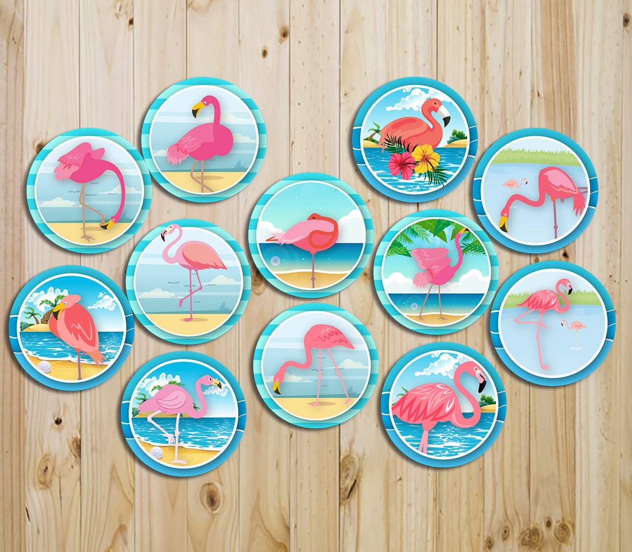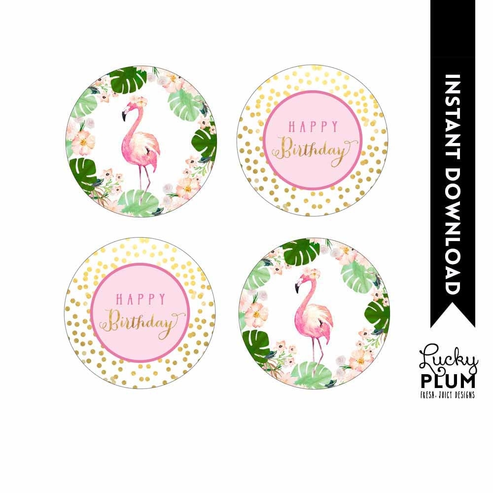 Flamingo Cupcake Toppers Tropical Luau Cupcake Toppers Flamingo Flowers Round Labels Aloha Printable FG01