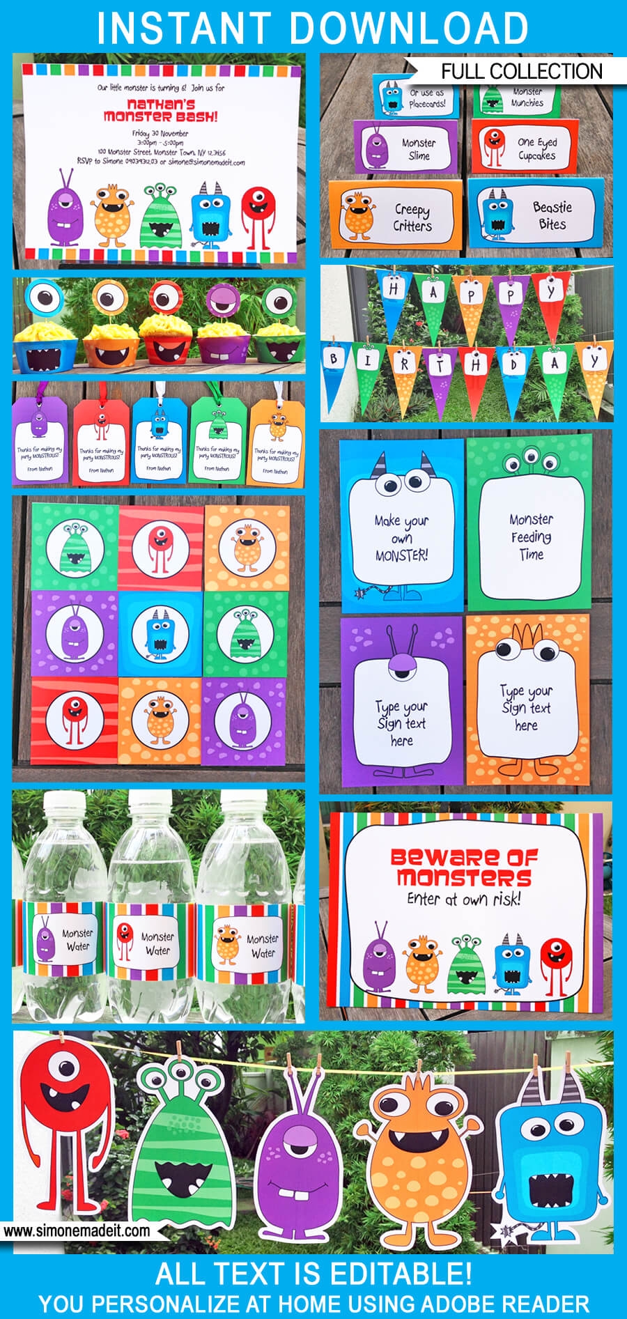 Our free monster party printables feature colorful and fun designs that will bring your party to life. You’ll find invitation templates, banners, cupcake toppers, favor tags, and even printable games like monster bingo and pin the eye on the monster.
