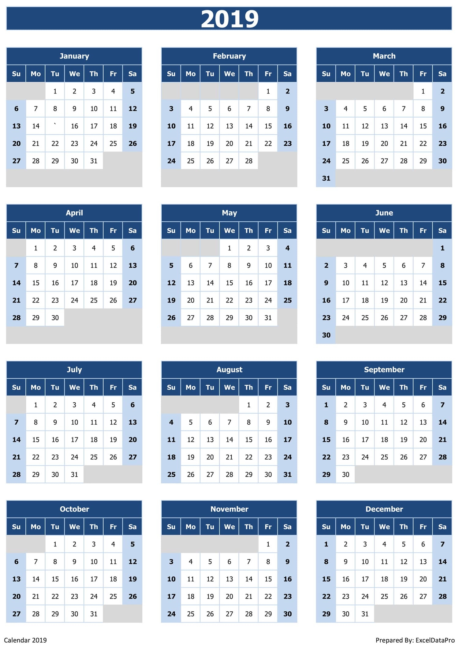 2019 Calendar Excel Templates Printable PDFs U0026 Images ExcelDataPro