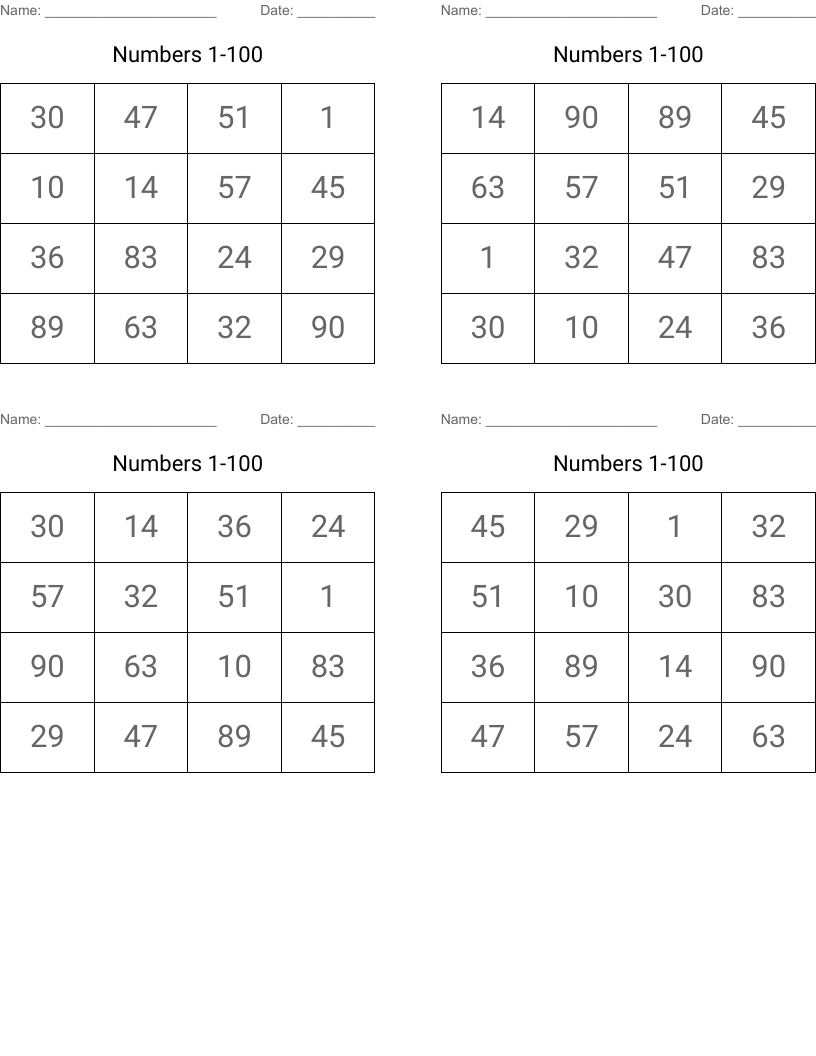 Numbers 1 100 Bingo Cards WordMint