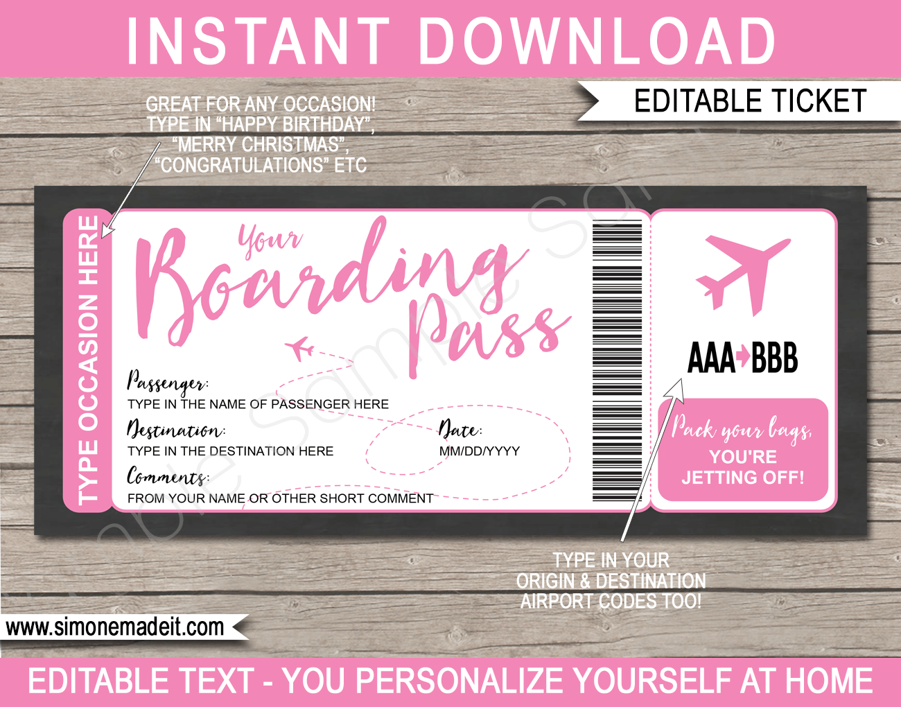 Printable Boarding Pass Ticket Template Fake Plane Ticket Trip Reveal
