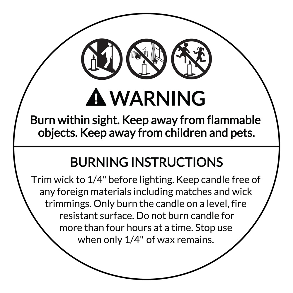 These labels include important safety information such as warnings to keep candles away from children and pets, to never leave a burning candle unattended, and to trim the wick before each use. By using these labels, you can help ensure that your customers enjoy their candles safely.
