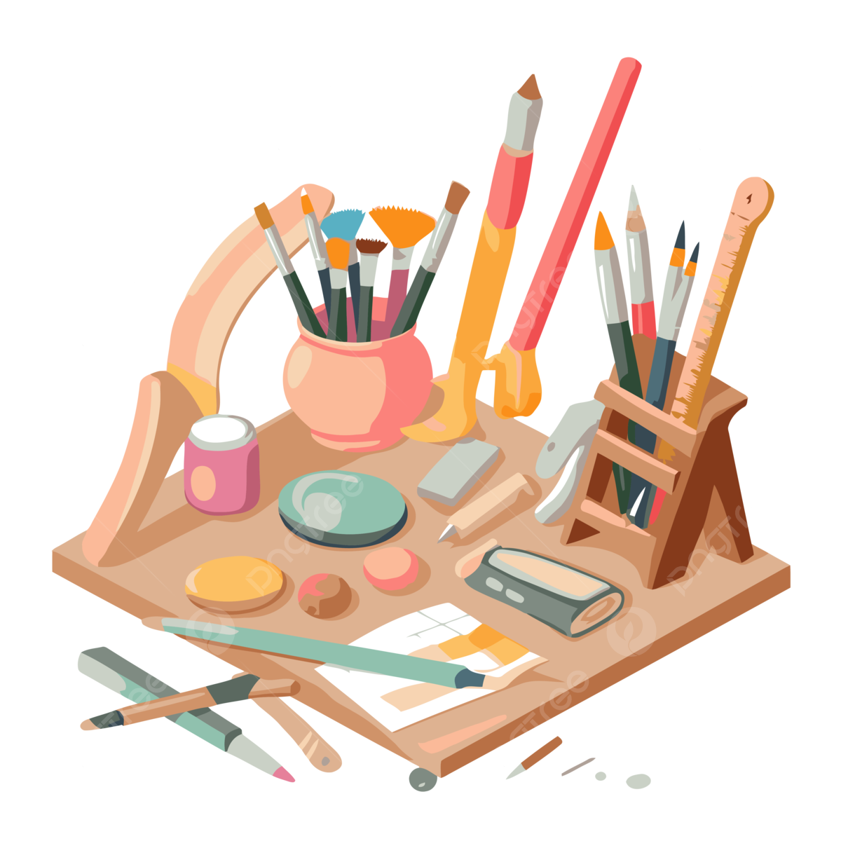 Craft Supplie Vector Sticker Clipart Number Of Art Tools And Supplies With A Table Cartoon Sticker Clipart PNG And Vector With Transparent Background For Free Download