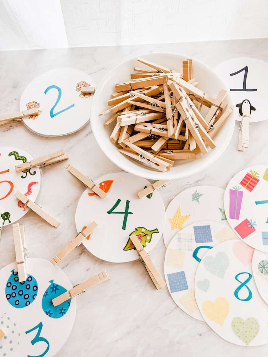 You can also create a DIY counting game by labeling clothespins with numbers and asking your child to clip the correct number of clothespins onto a card with dots or objects. This activity helps with number recognition and counting skills.