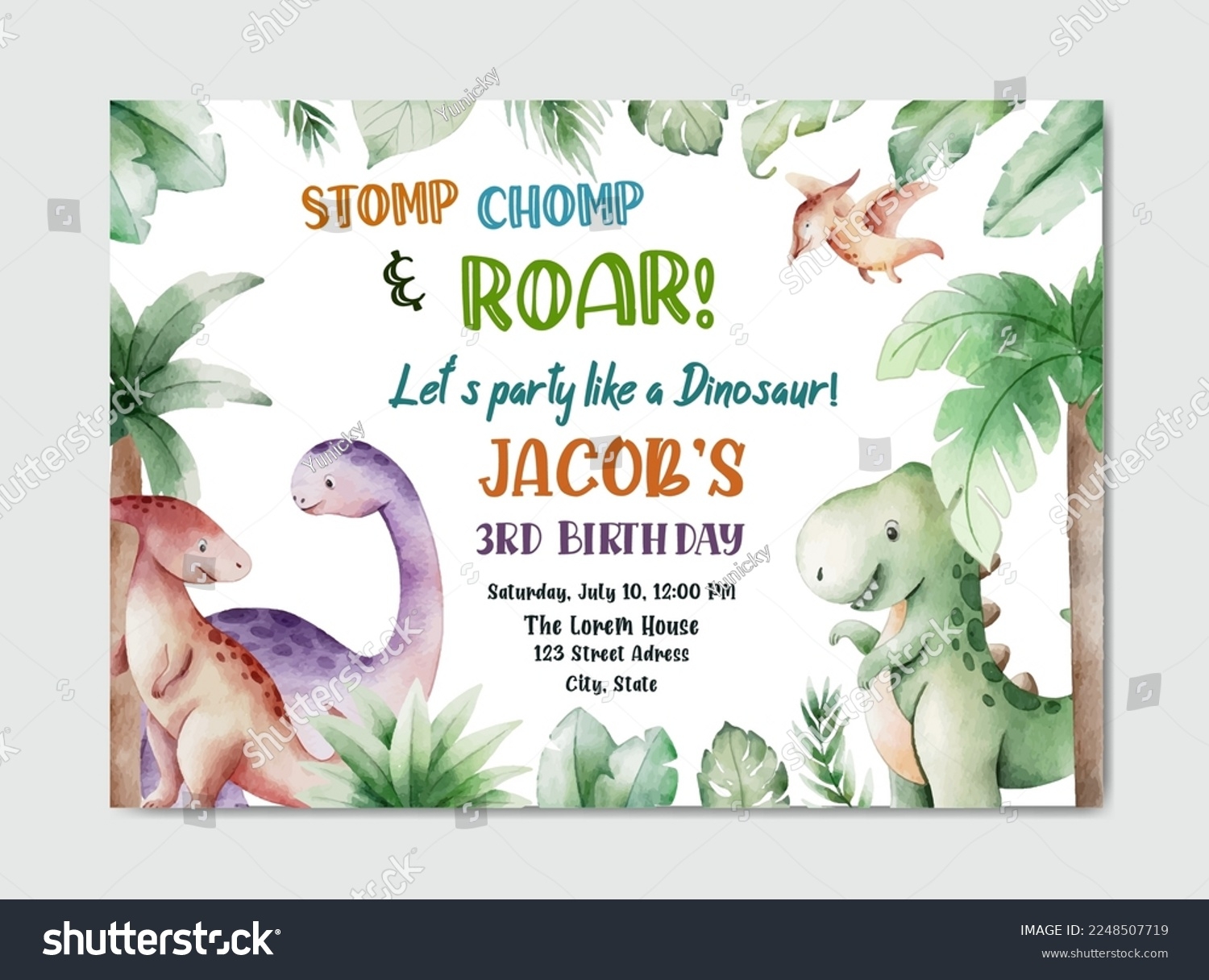 Vektor Stok Birthday Dinosaur Theme Watercolor Invitation Card Tanpa Royalti 2248507719 Shutterstock