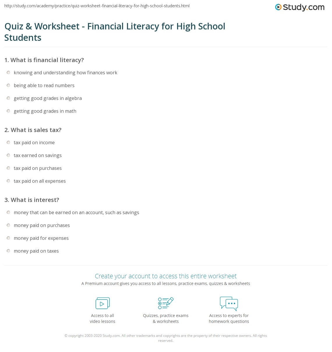 Quiz U0026 Worksheet Financial Literacy For High School Students