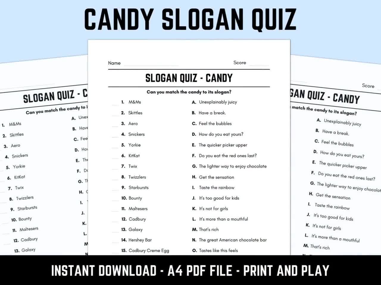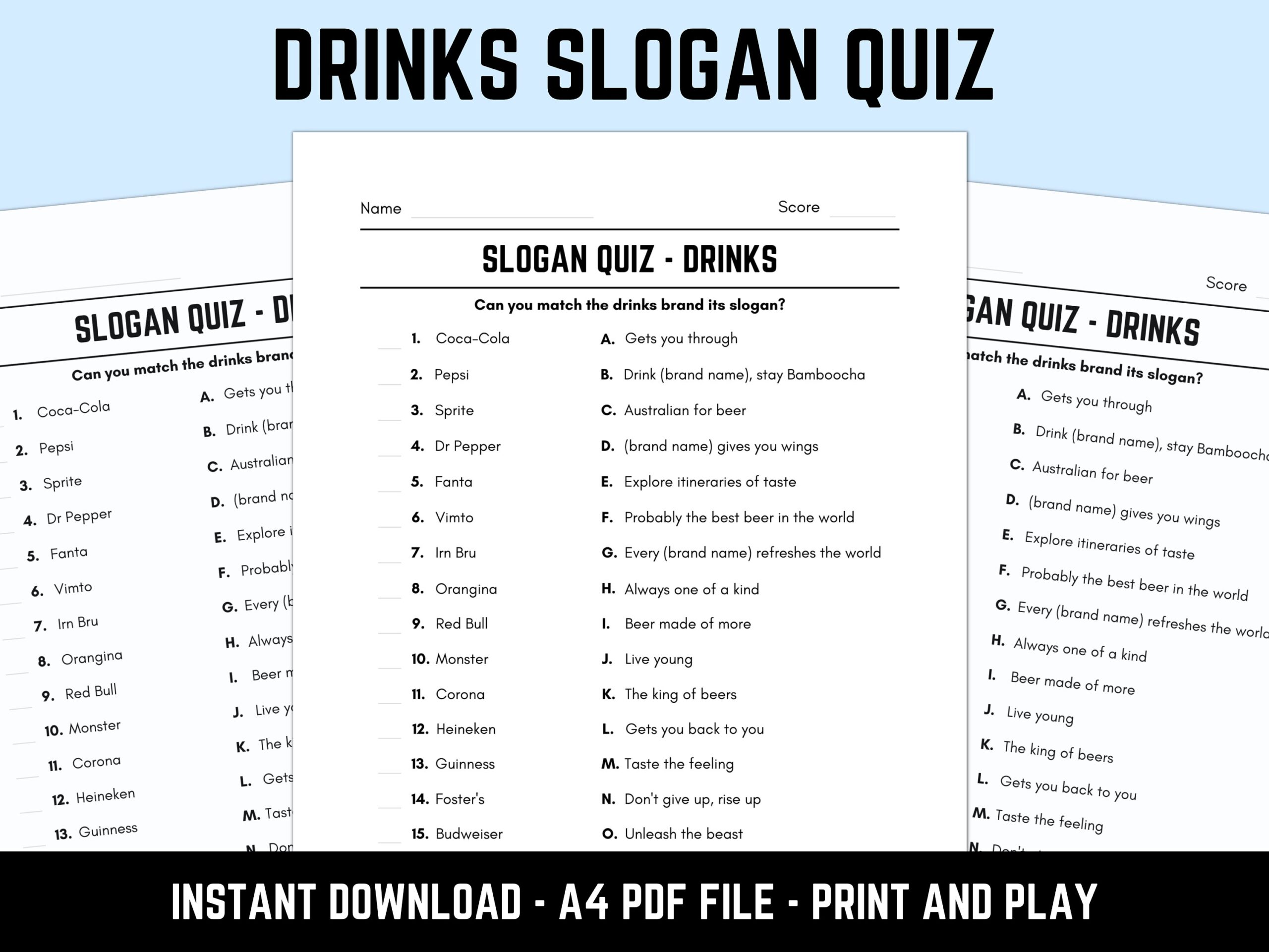 To play the free printable slogan quiz, simply distribute the quiz sheets to each player or team. Set a timer for each round, and have everyone work together to fill in the correct brand names for each slogan. The team with the most correct answers at the end wins!