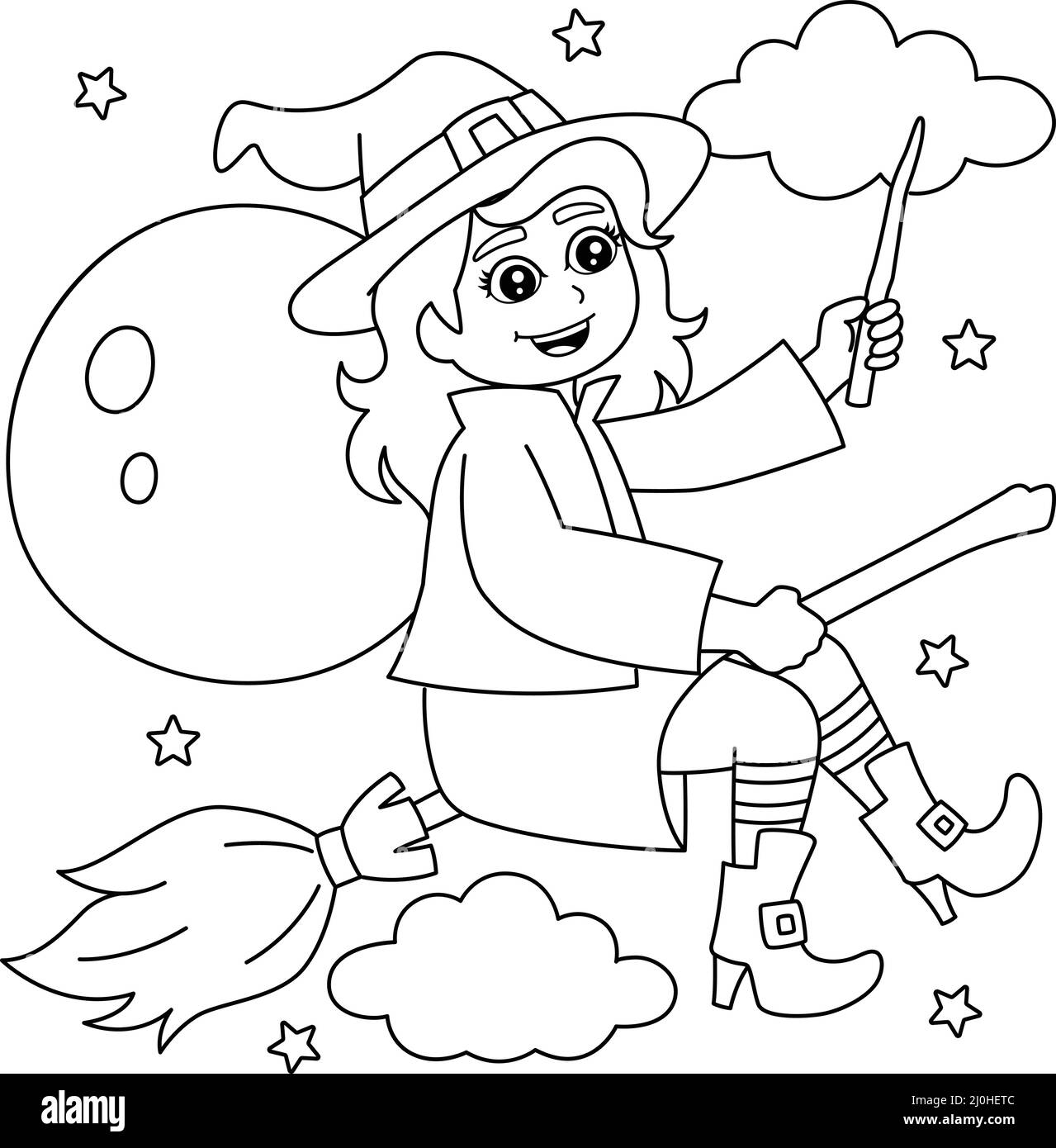 Witch Girl In A Broomstick Coloring Page For Kids Stock Vector