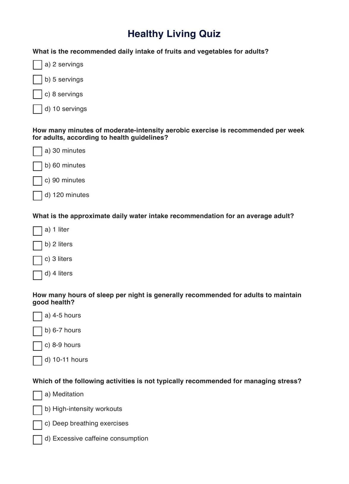 Our health and wellness quiz printable is designed to be engaging and informative. You can challenge yourself with questions on topics like healthy eating habits, the importance of staying active, and ways to manage stress effectively.