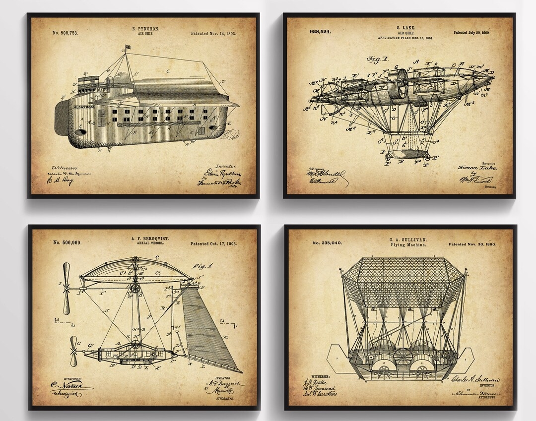 4 Airship Blueprint Drawing Balloon Machine Patent Art Flying Apparatus Invention Wall Decor Antique Aviation Wall Art Home Wall Decor Etsy