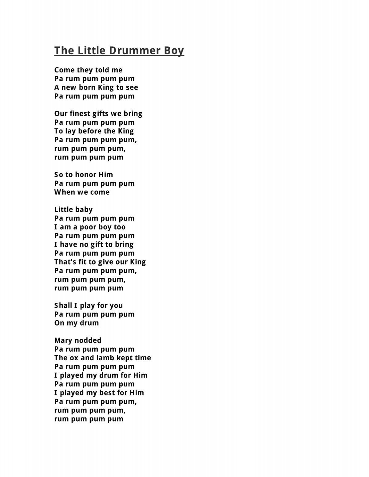 Adding a little drummer boy lyrics printable helps improve learning skills when it comes to building early skills. These resources are especially helpful for practicing attention to detail. With instant printability, you can adapt them for different skill levels. Whether added to a family game night, a educational crossword puzzle makes learning feel like a game. They might be simple, but they build strong thinking habits.