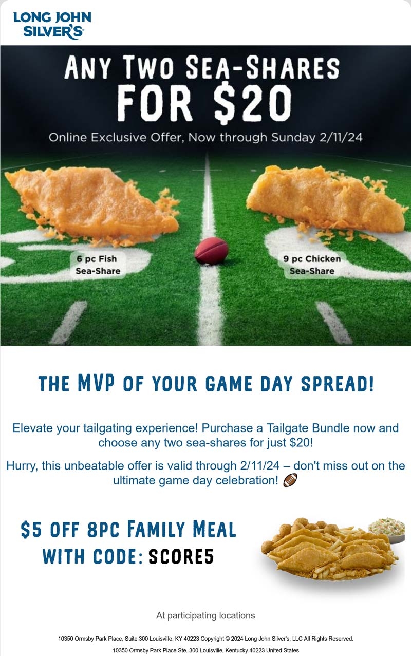 6pc Fish 9pc Chicken Also 15 Battered Grilled Or Popcorn Shrimp U003d 2 For 20 At Long John Silvers Also 5 Off 8pc Via Promo Code SCORE5 longjohnsilvers The Coupons App