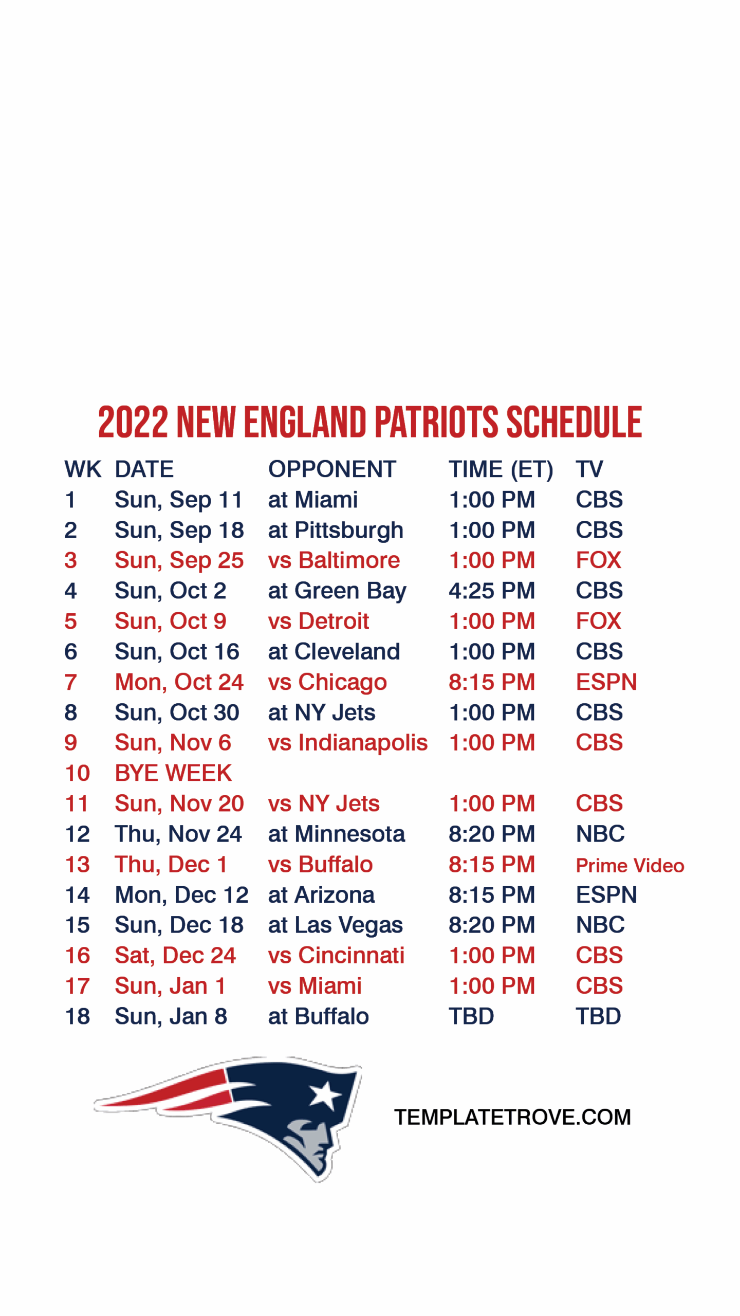 With the New England Patriots printable schedule, you can easily see when and where each game will take place. Hang it on your fridge, bulletin board, or anywhere else you’ll see it regularly to stay on top of all the action.