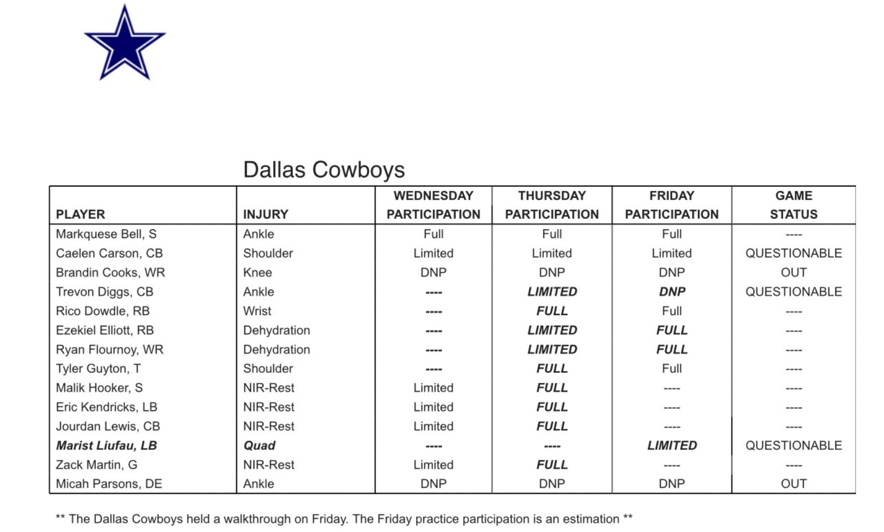 Week 5 Injury Report Cowboys Superstar Misses First Game