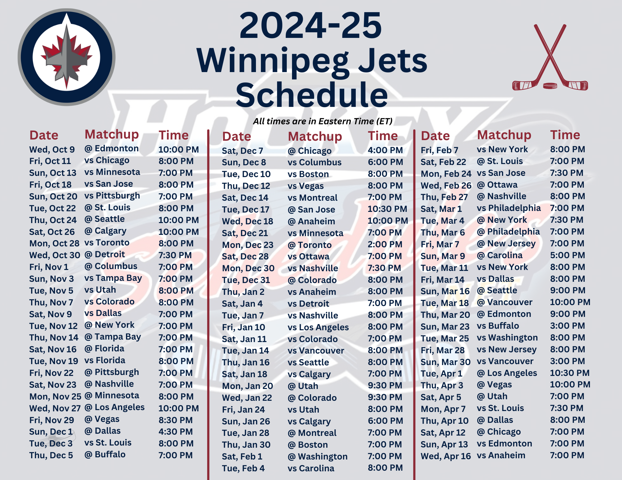 Printable 2024 25 Winnipeg Jets Schedule Matchups PDF Format Hockey Schedules