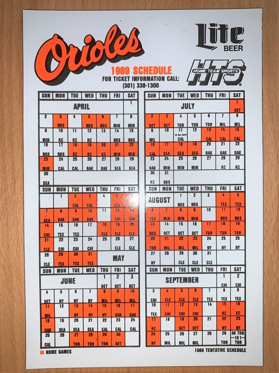 1989 BALTIMORE ORIOLES MLB BASEBALL SCHEDULE MAGNET MILLER LITE BEER U0026 HTS