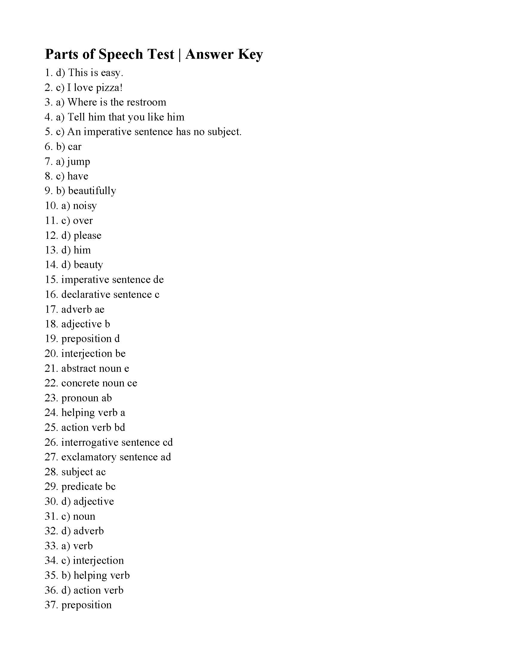 Parts Of Speech And Sentence Type Test Answers