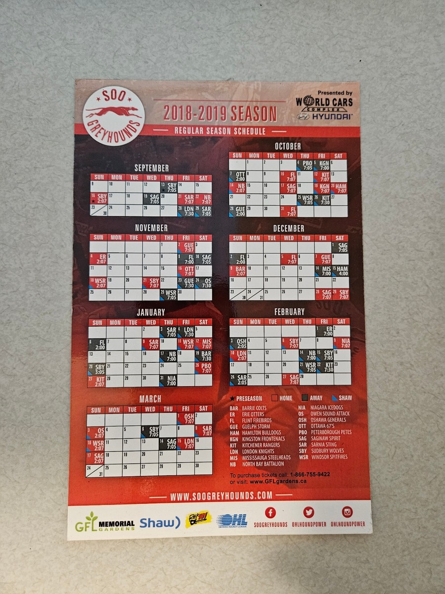 MS20 SOO Greyhounds 2018 19 OHL Hockey Magnet Schedule Multi