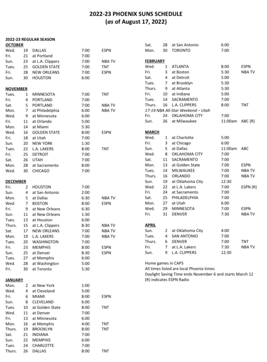 Printable 2024 25 Phoenix Suns Schedule TV Broadcasts And Matchups Sports Brackets