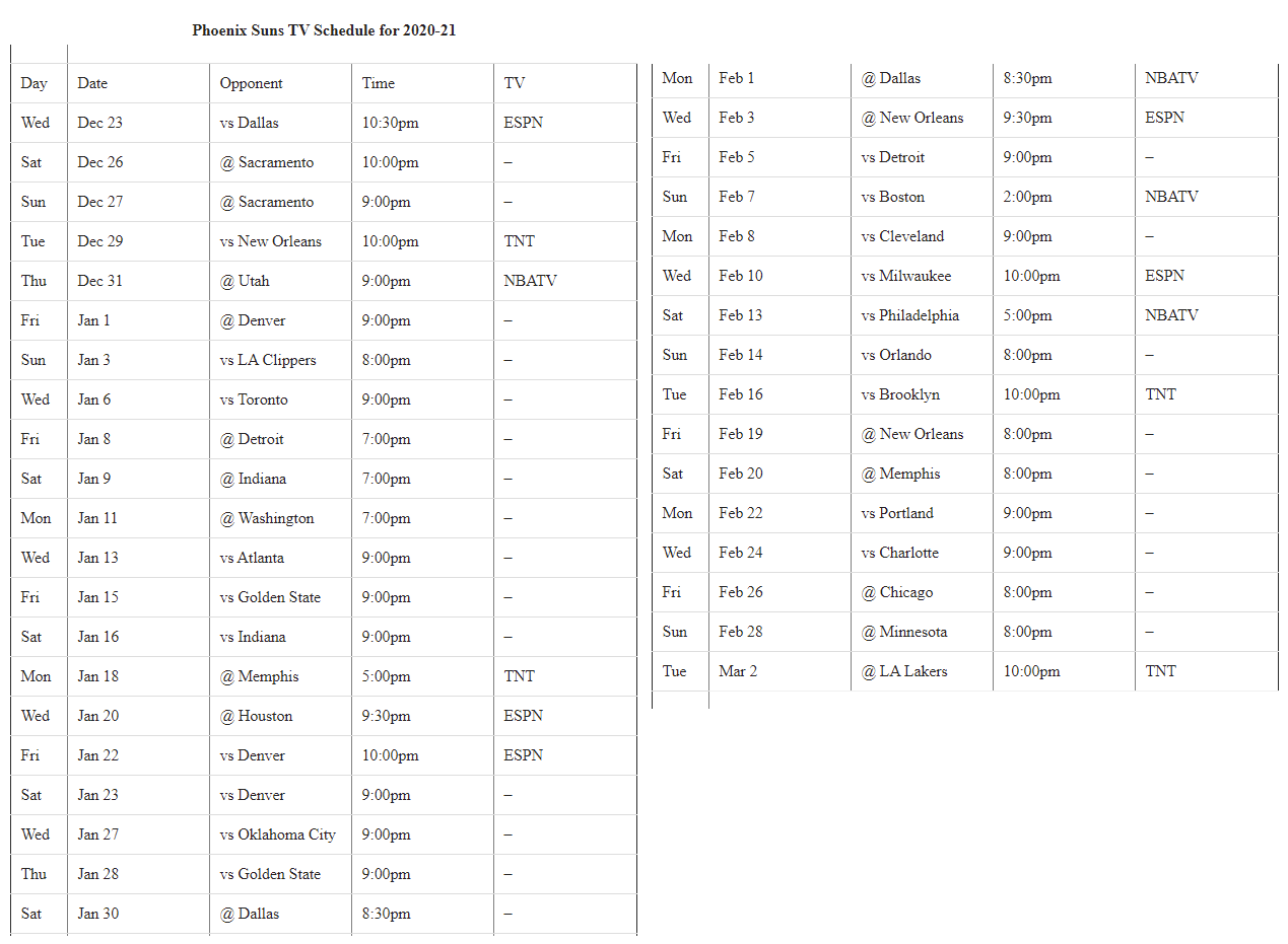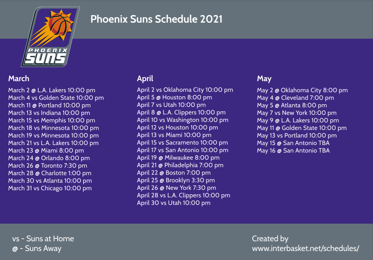 Printable Phoenix Suns Schedule TV Schedule For Remainder Of 2020 21 Season Interbasket