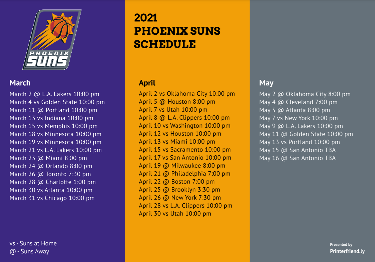 So what are you waiting for? Download your Phoenix Suns schedule printable now and get ready to show your team spirit all season long. Go Suns!