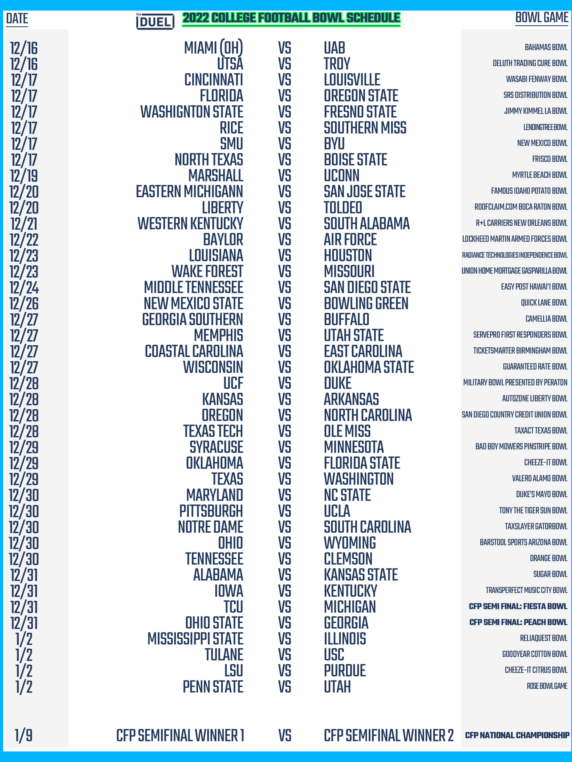 Whether you’re rooting for the underdog or cheering on a powerhouse program, there’s nothing quite like the excitement of college football bowl games. With this printable schedule at your fingertips, you’ll never have to worry about missing a kickoff or touchdown pass.