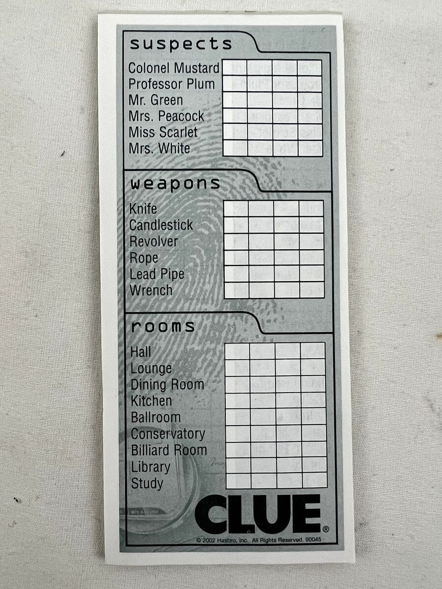CLUE Board Game 2002 2005 Replacement Pieces Parts Pad 30 Sheets