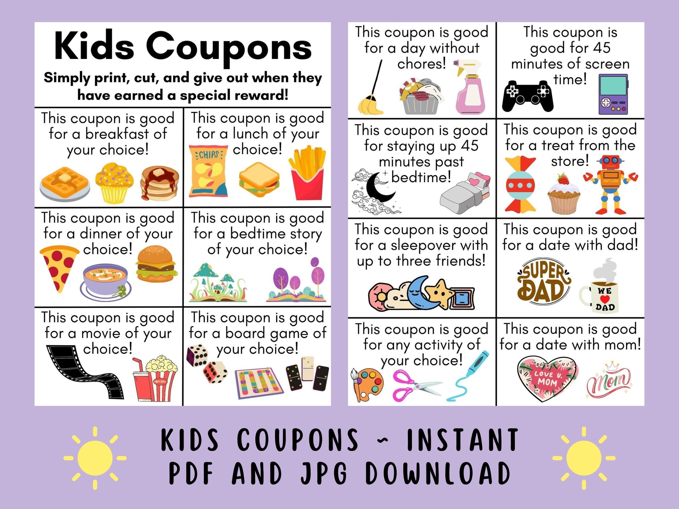 Printable coupons for kids come in all shapes and sizes, from extra screen time or a special dessert to a day at the park or a movie night. You can customize them to suit your child’s interests and needs, making them a versatile and personalized parenting tool.