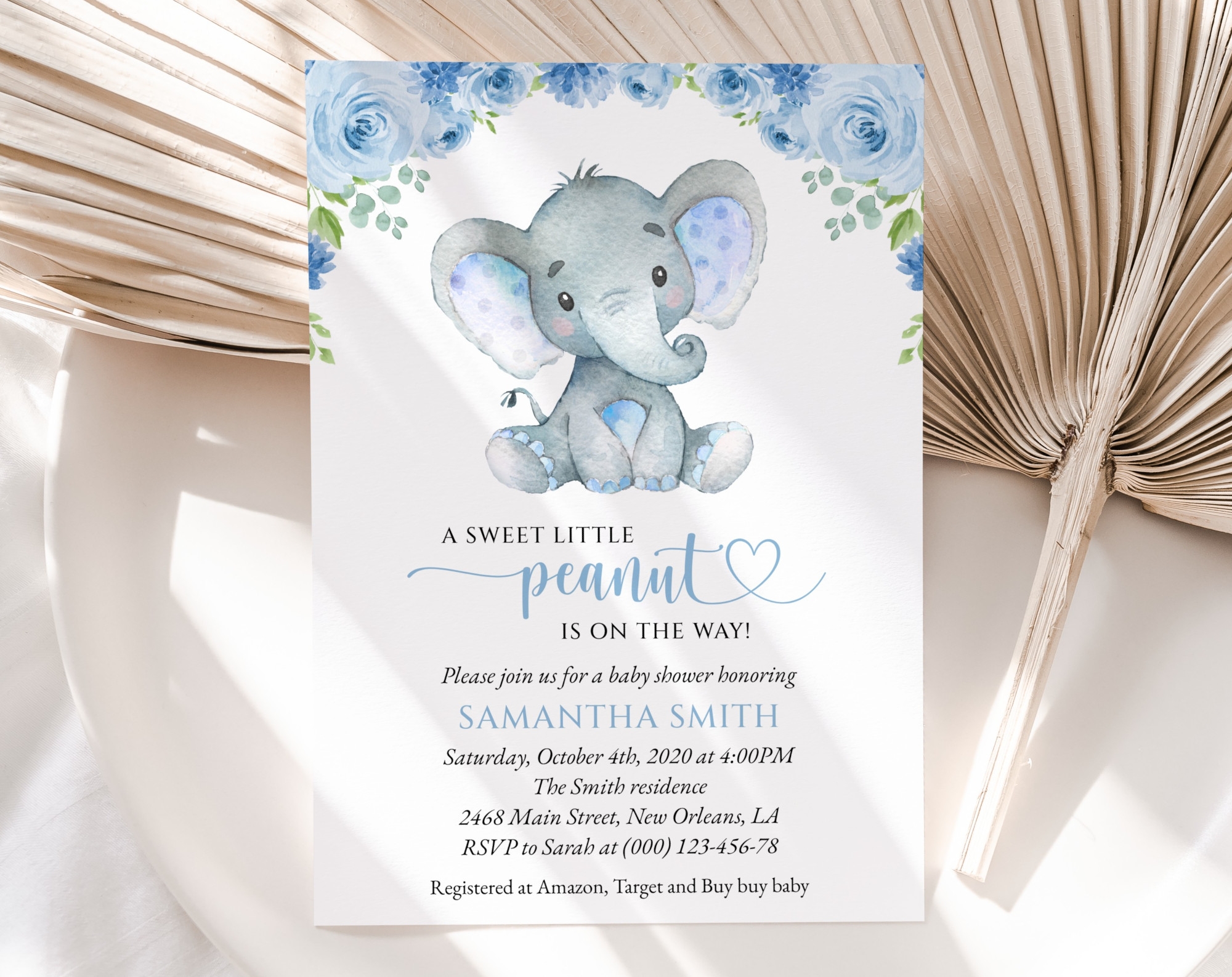 Boy Elephant Baby Shower Invitation Template EDITABLE Blue Floral