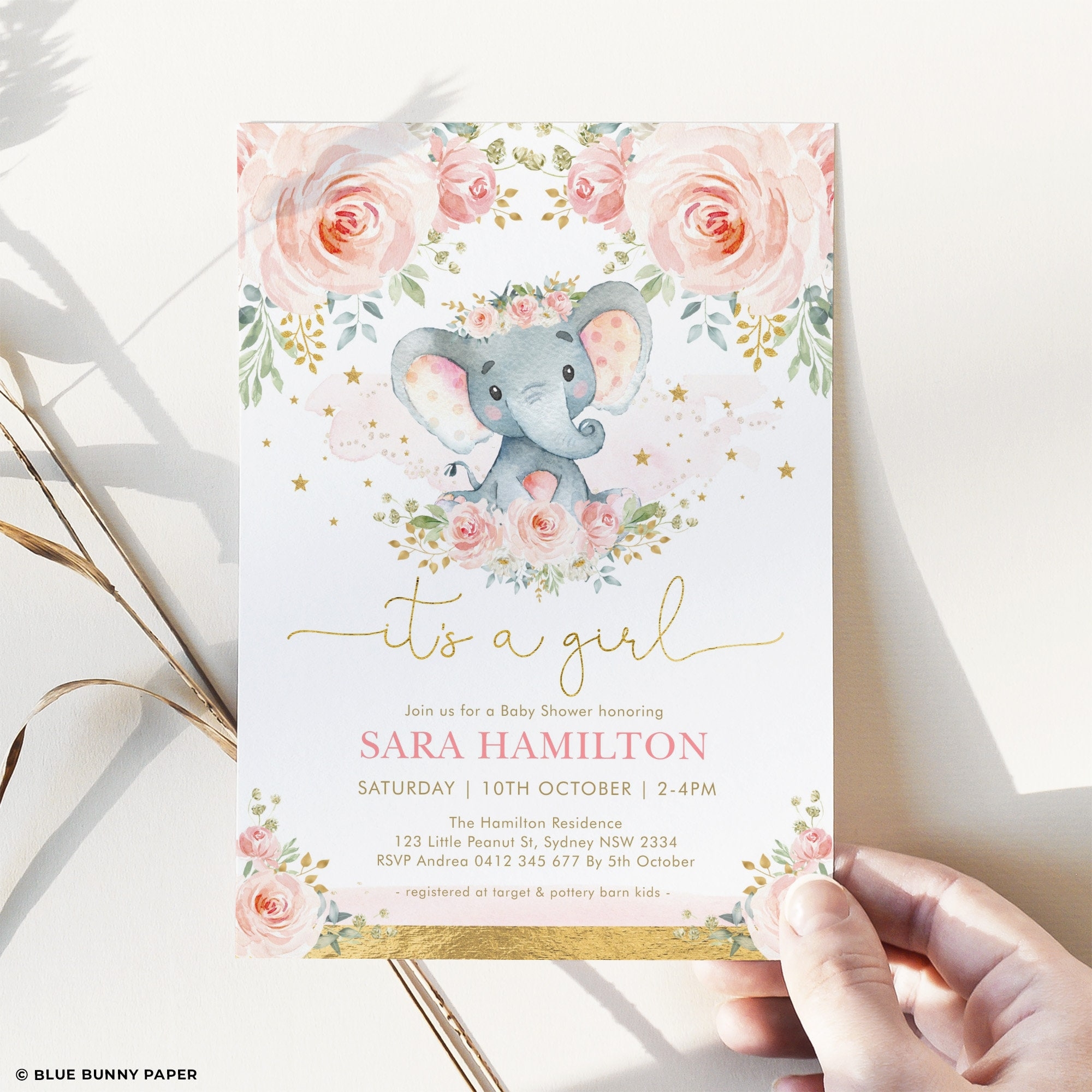 Editable Girl Elephant Baby Shower Invitation Blush Pink Floral