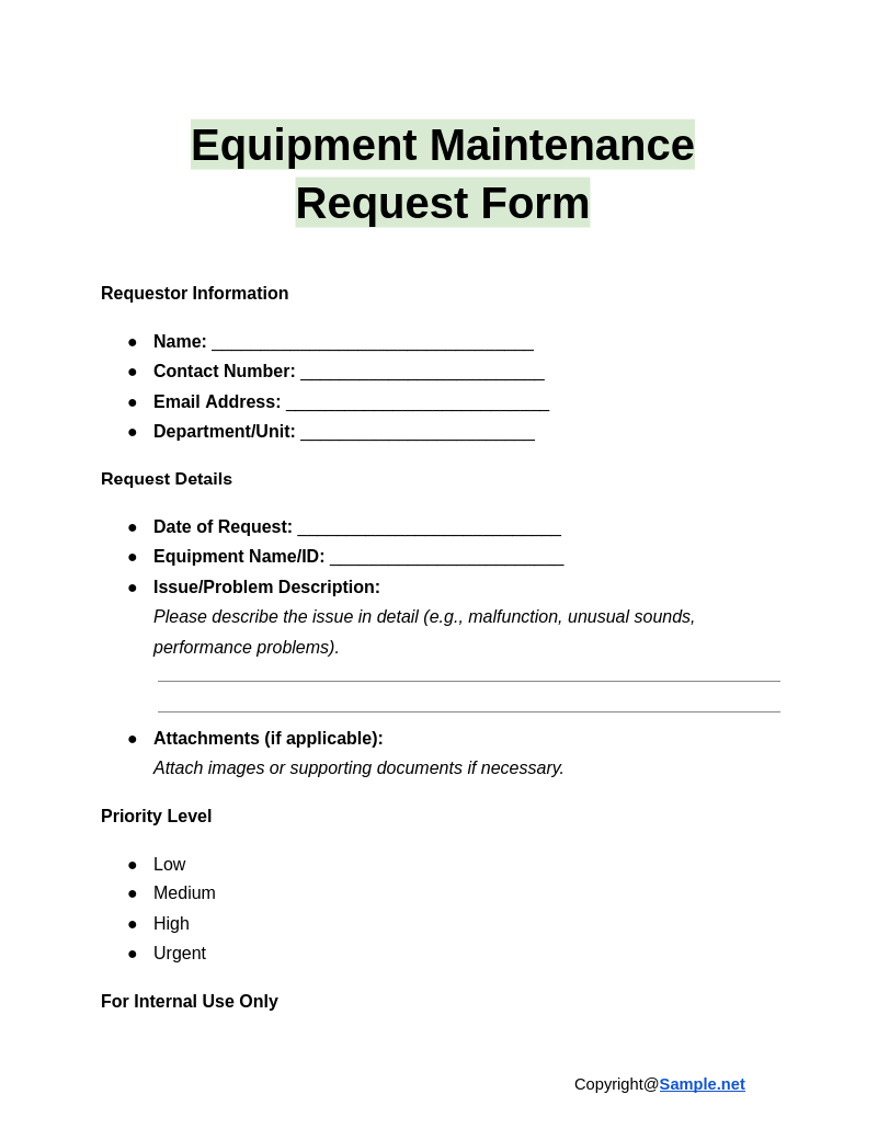 With our user-friendly template, you can easily document equipment issues, schedule maintenance, and track progress all in one place. No more searching for lost forms or deciphering illegible handwriting. Simply print out the template, fill it out, and you’re good to go!