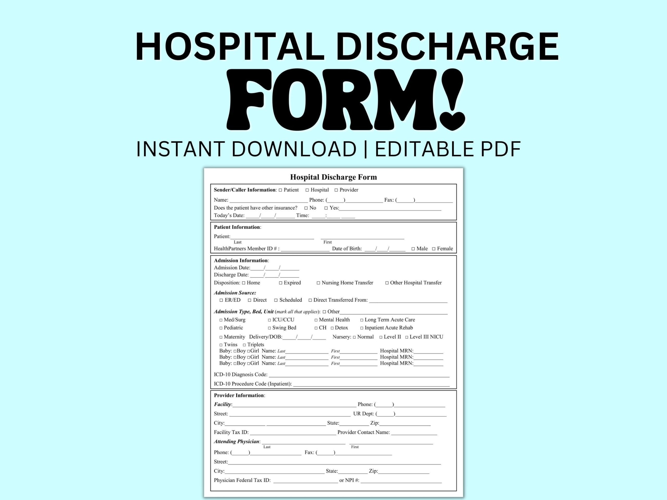 Hospital Discharge Form Editable PDF Template For Medical Offices Doctors Providers Instant Download Patient Medical Form PDF Etsy Ireland